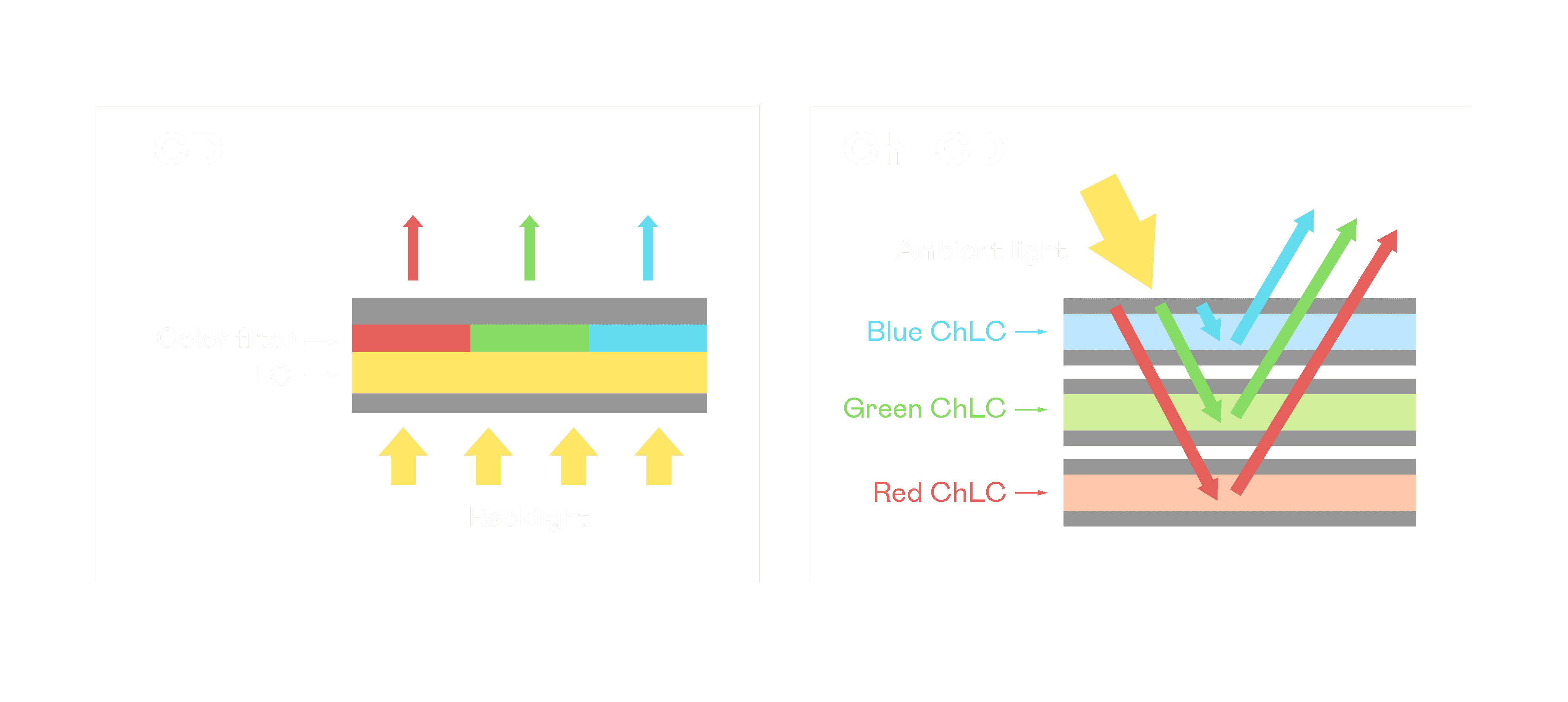 ChLCD 胆固醇液晶就如同纸张一样,,透过反射环境光来显示影像,,因此长时间观看不易造成人眼视觉疲劳,,,,可达到护眼效果。。当处于户外阳光下使用,,LCD 影像容易失真而不易观看,,,但胆固醇液晶仍可维持较佳的影像品质。。。。