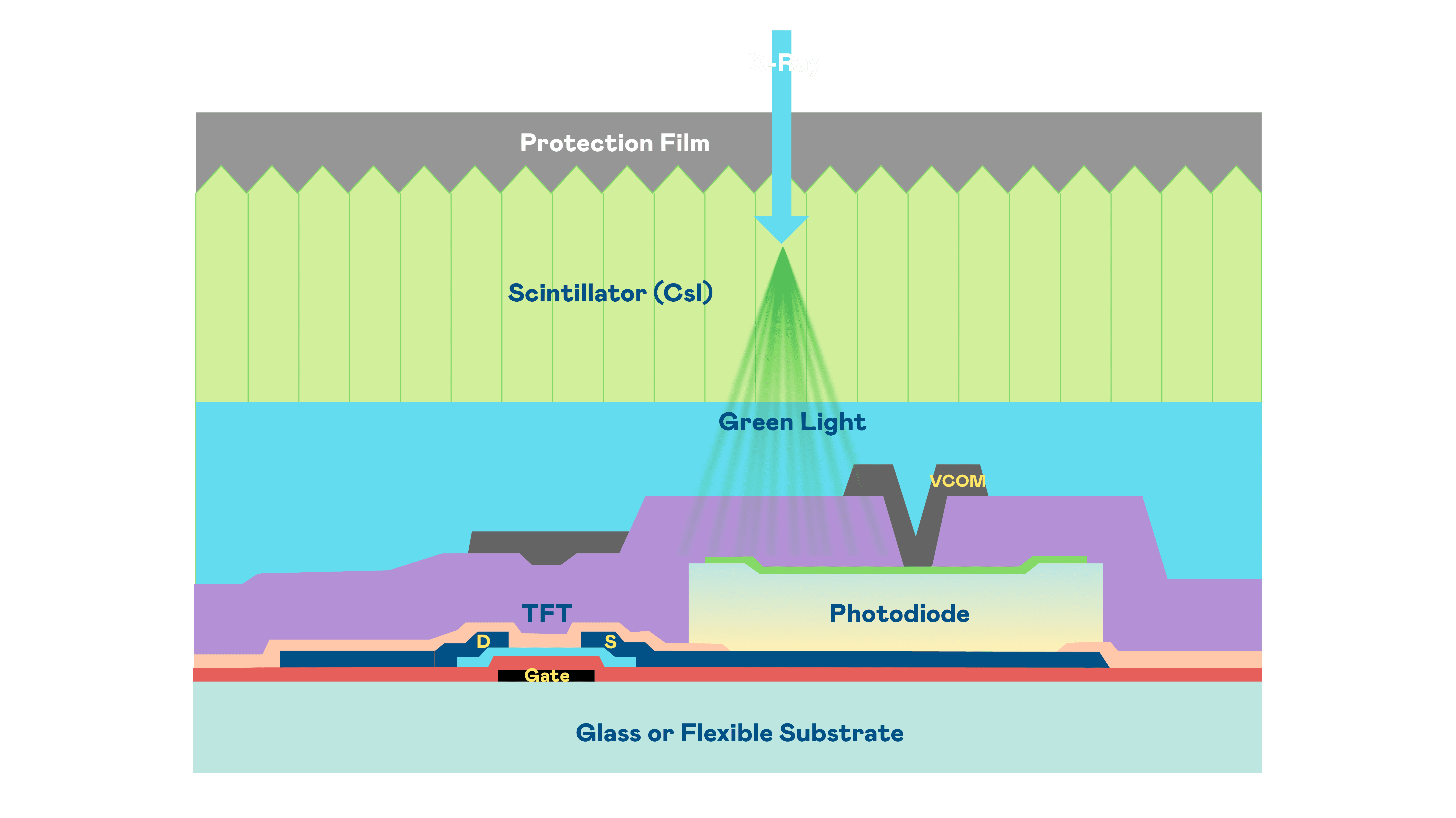 MG电玩的X光影像感测阵列使用薄膜电晶体 (TFT) 作为每个像素的读取开关,,,搭配光电二极体(Photodiode)的光电转换元件,,用以感测X光影像讯号。。。。